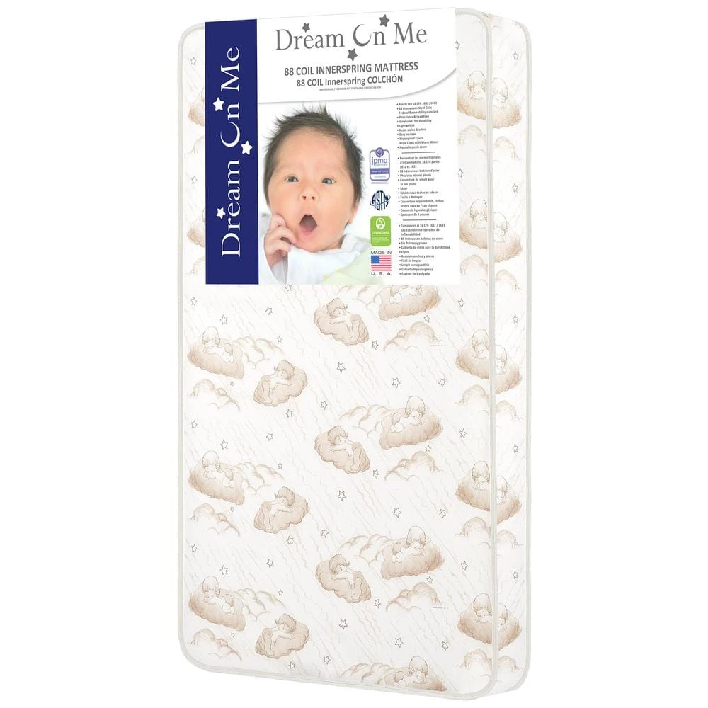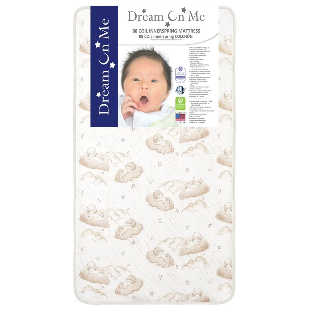 Your baby will curl-up in comfort on the Twilight Spring Coil Mattress by Dream On Me. Constructed with quality materials and workmanship this mattress is manufactured. This lightweight mattress offers 80 durable, interwoven, heat tempered, steel coils providing supreme comfort to support his or her growing bones. A protective polyurethane foam wrap on each side delivers a plush sleeping surface. Features include a hypo-allergenic, foam Insulating layer and lock-stitched waterproof binding for lasting durability and a layer of Fire blocker. The phthalate and lead free, triple laminated waterproof cover is stain-resistant to help protect against liquids leaking inside. Wipes clean with mild soap and water; reversible design allows mothers to choice a brown cloud print or a white side. This mattress meets the 16 CFR 1632 /1633 Federal Flammability