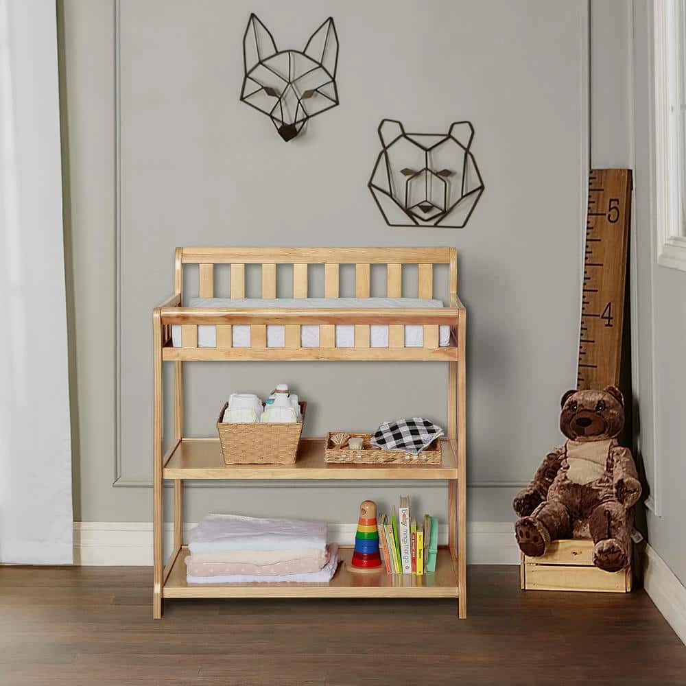 Dream on Me Ashton Collection Changing Table is perfect for any nursery. This changing table has a clean line design, a water-resistant mattress pad for changing including a safety strap with a fully enclosed dressing area for extra security. Dream on Me Ashton changing table has 2 fixed shelves for open storage which is ideal for diapers, wipes and other essentials. This changing table can transition into a night stand as your baby gets older. Dream on Me Ashton changing table coordinates with the Dream on Me Ashton 5-in-1 Crib. Safety is our top most priority. All our products meet/exceed applicable ASTM and CPSC standards..