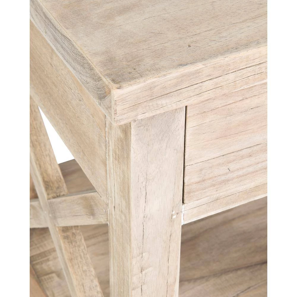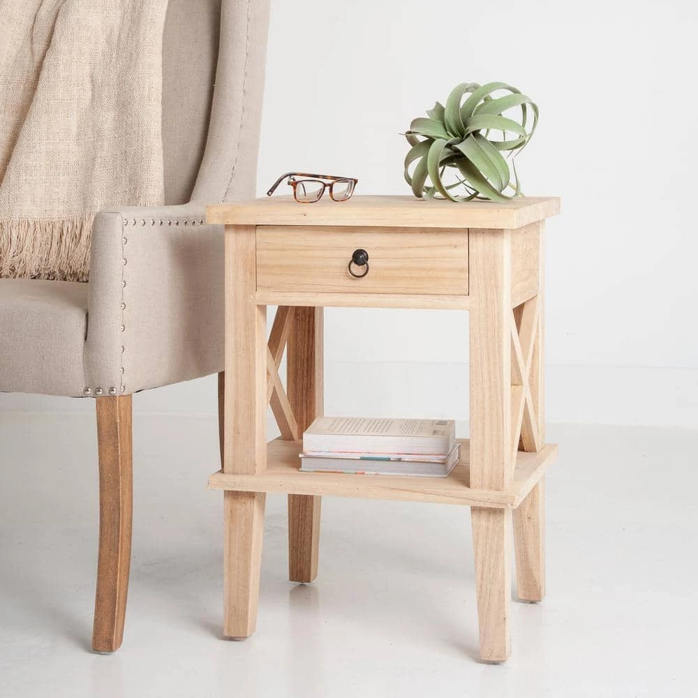An instant classic in modern rustic design, the Bevan Side Table beautifully features all natural mindi wood in its unfinished form! Petite enough to live next to your bedside or chair side, each piece features a drawer and lower shelf for additional storage options. Each piece’s craftsmanship is apparent with the X-design on either side for a beautiful bonus!