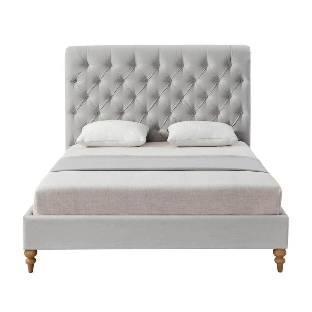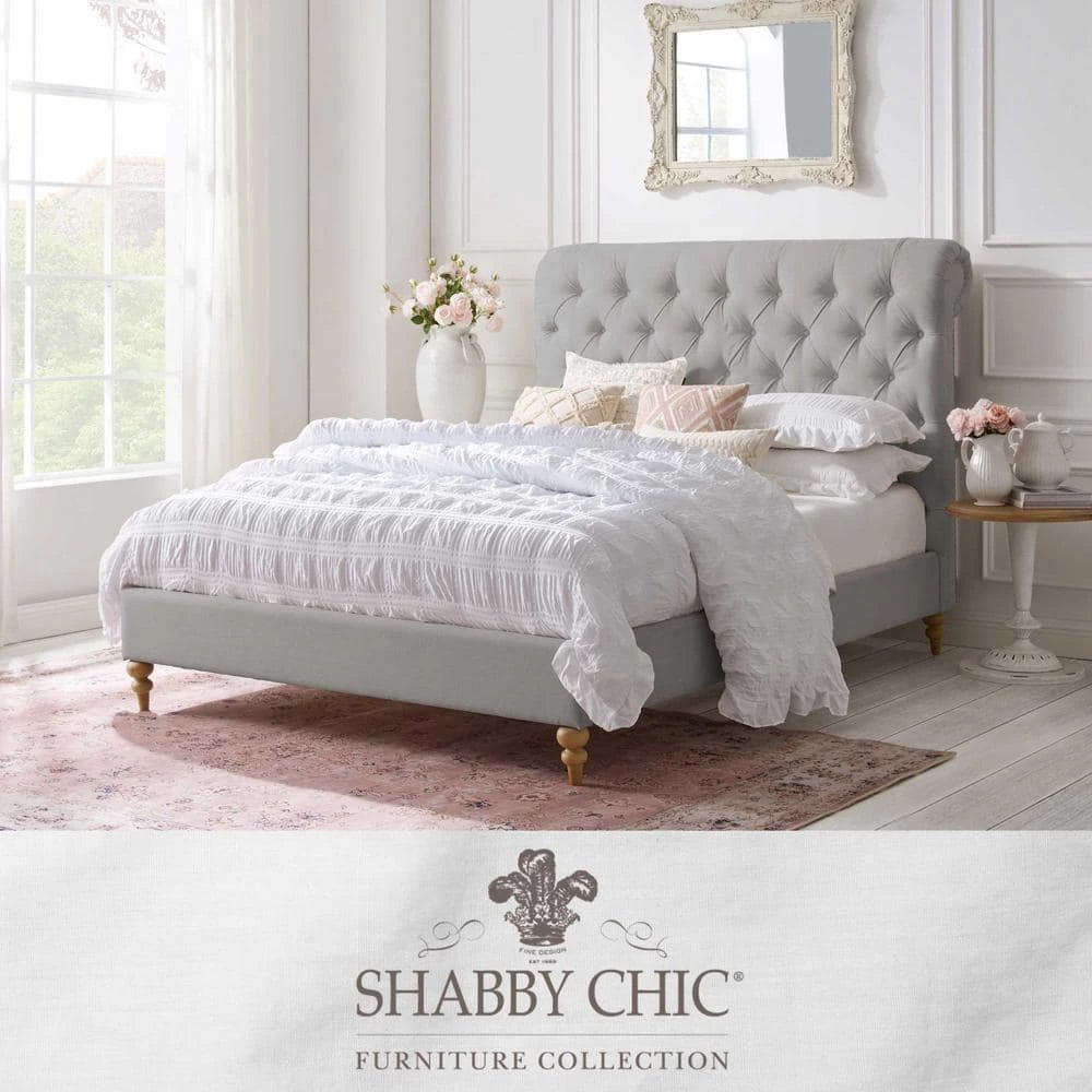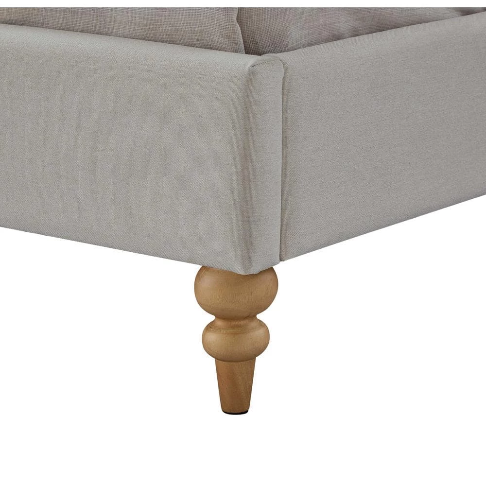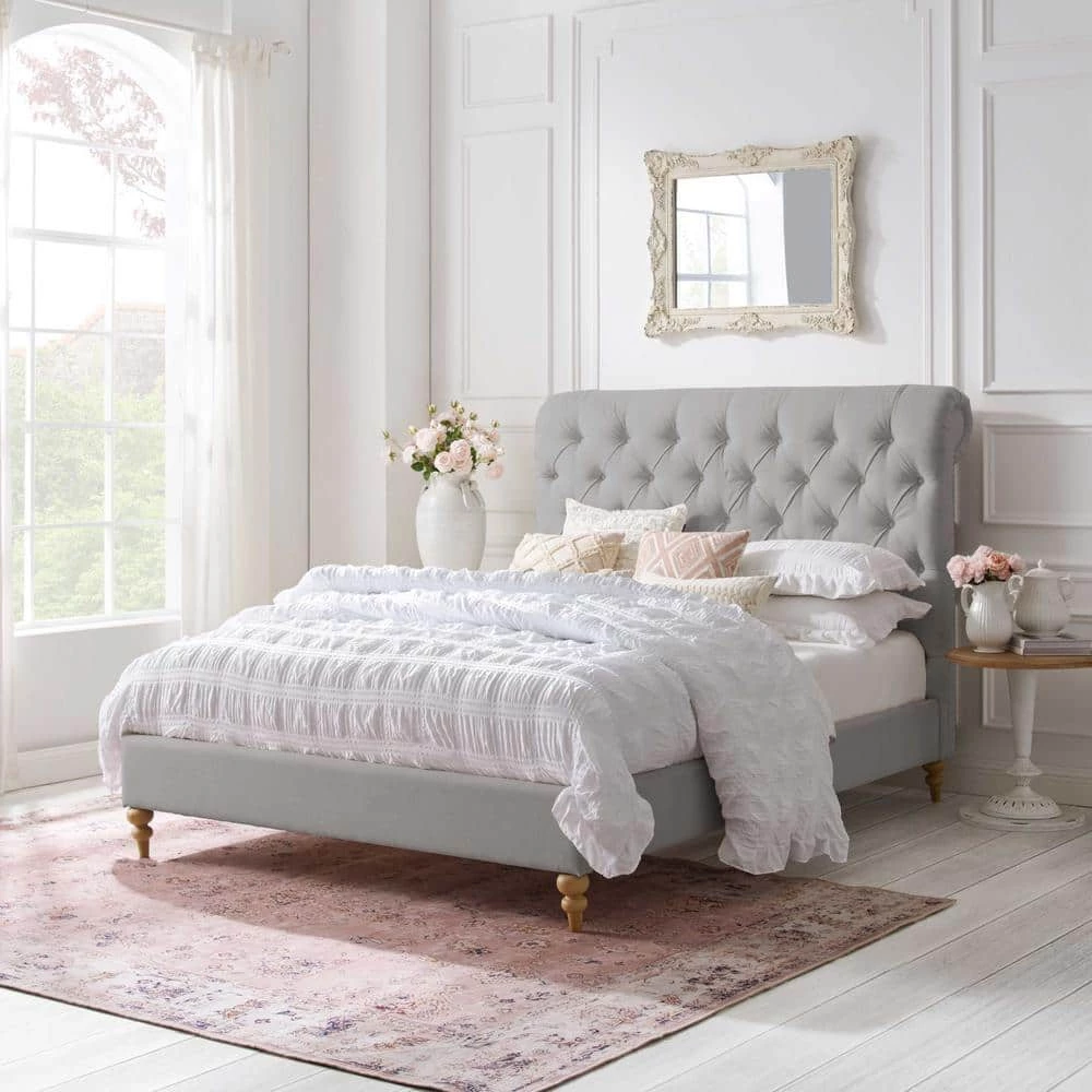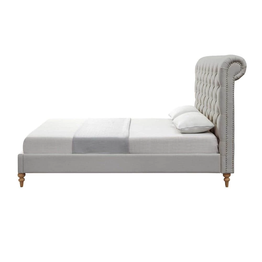 Generously padded headboard features deep handcraft button tufting that creates a luxury decorative retro feeling. This beautiful bed in King/Queen/Twin size is ideal for any decor with its low profile yet astonishing design. Bun shaped tapered legs in natural finish, rolled top headboard, nailhead trim, linen upholstery all these details bring retro touch to this magnificent piece of classic furniture. This Shabby Chic traditional upholstered bed will give your room a soothing look that makes it easier to relax and fall asleep.