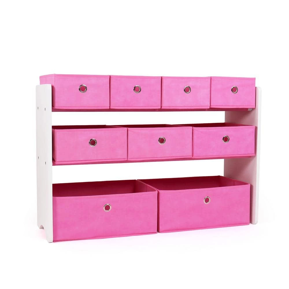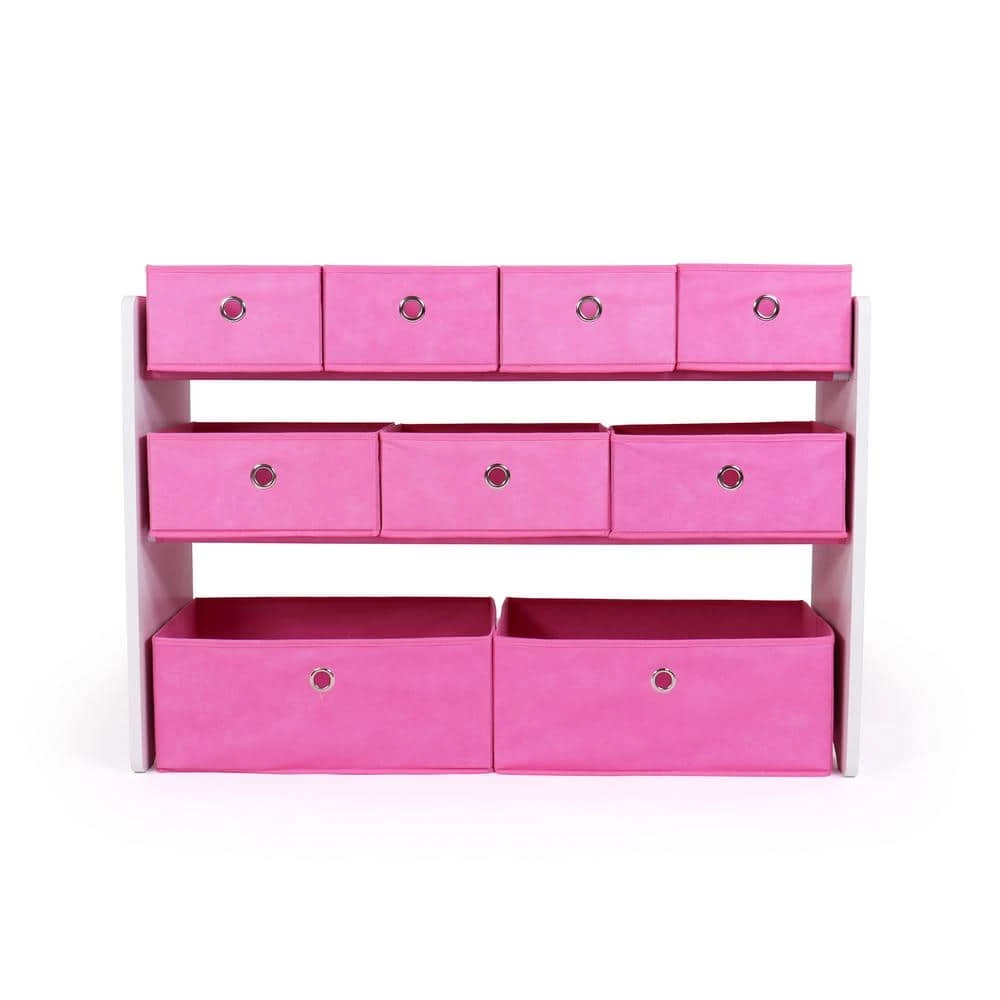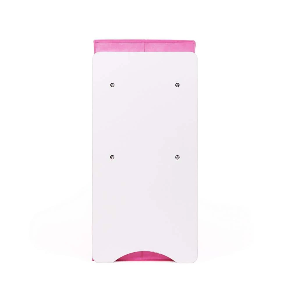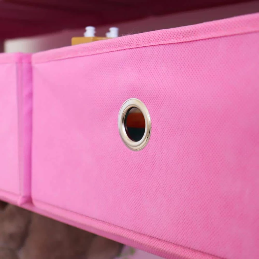 - White wooden finish with pink colored fabric toy bins.