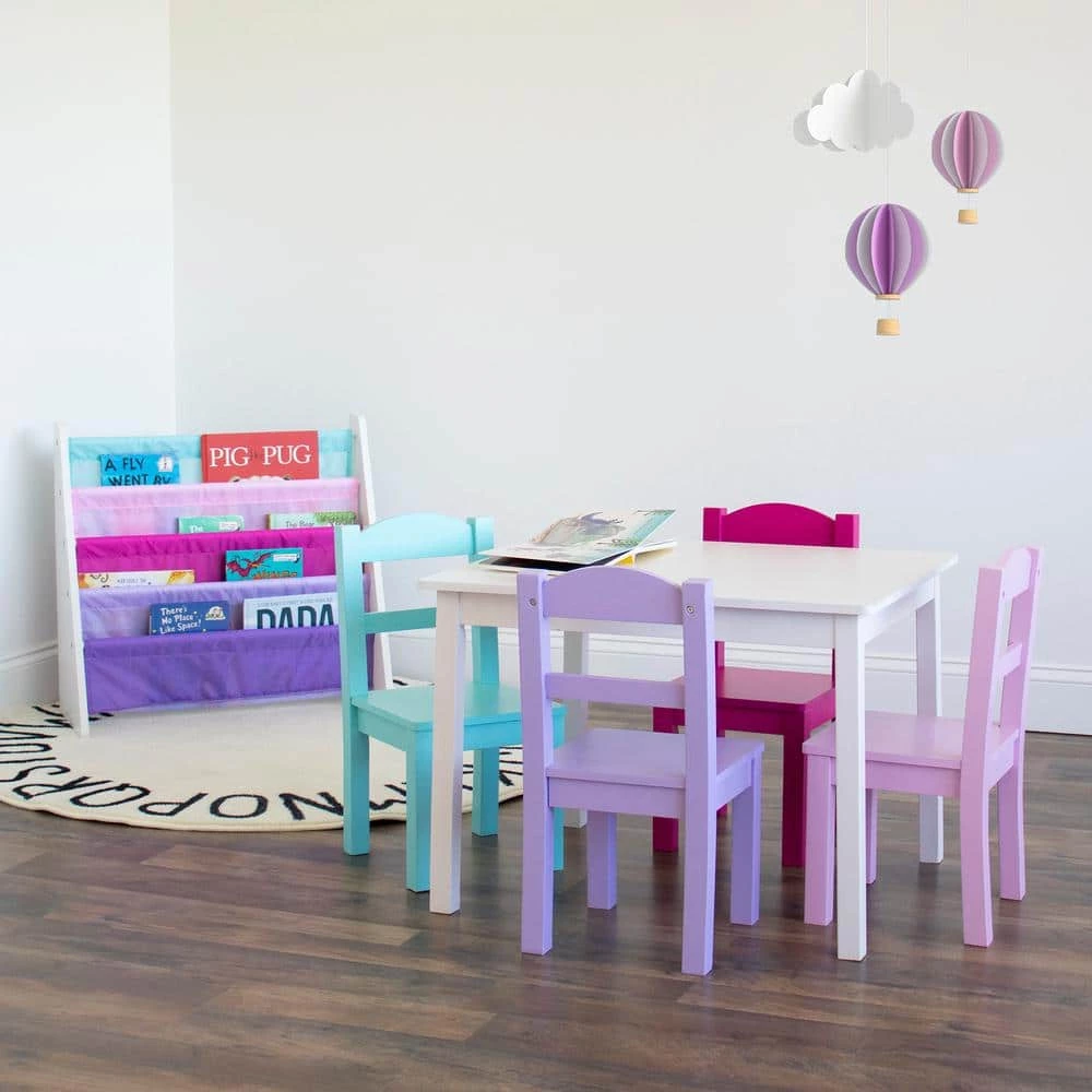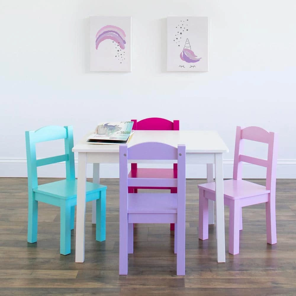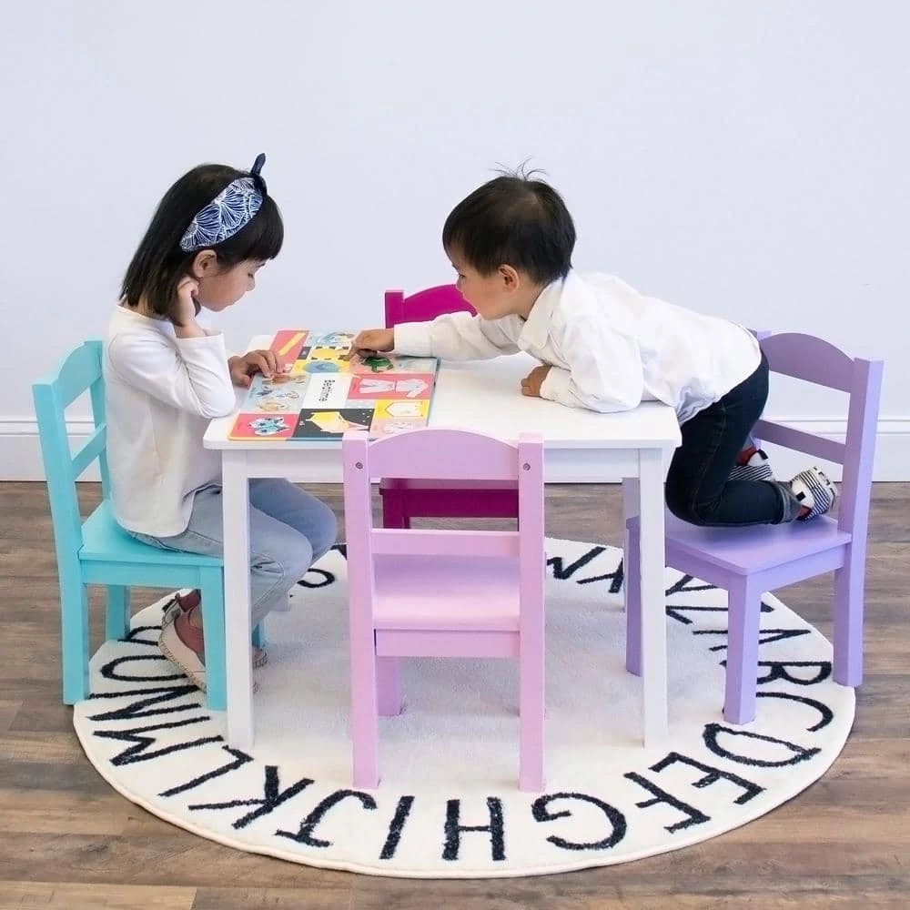 Perfectly sized to meet your growing child’s needs, the Humble Crew 5-Piece Kids Wood Table and 4 Chair Set is sturdy, stylish and simple to clean. This set can be used as a homework study desk, an arts and crafts activity center, or a board game table. It is also a great homeschooling solution for young students doing online school from home.The height of this furniture is just right for toddlers and preschool-aged children; giving your little one a table and chair set at their size gives them a sense of control and helps them learn independence. From snack time to playtime this set will quickly become your little one’s very own favorite spot in the house to draw and color, read, do puzzles, host tea parties, play cars and trucks, and more.The set includes a rectangular table and four chairs in a stylish colorway sure to complement your home’s existing furniture whether it be in your toddler’s bedroom, playroom or the living room. This furniture set is easy to assemble with all hardware included. The sturdy table and chairs feature solid wood legs for additional support and long-lasting durability, ideal for boys and girls aged 3-8 years.