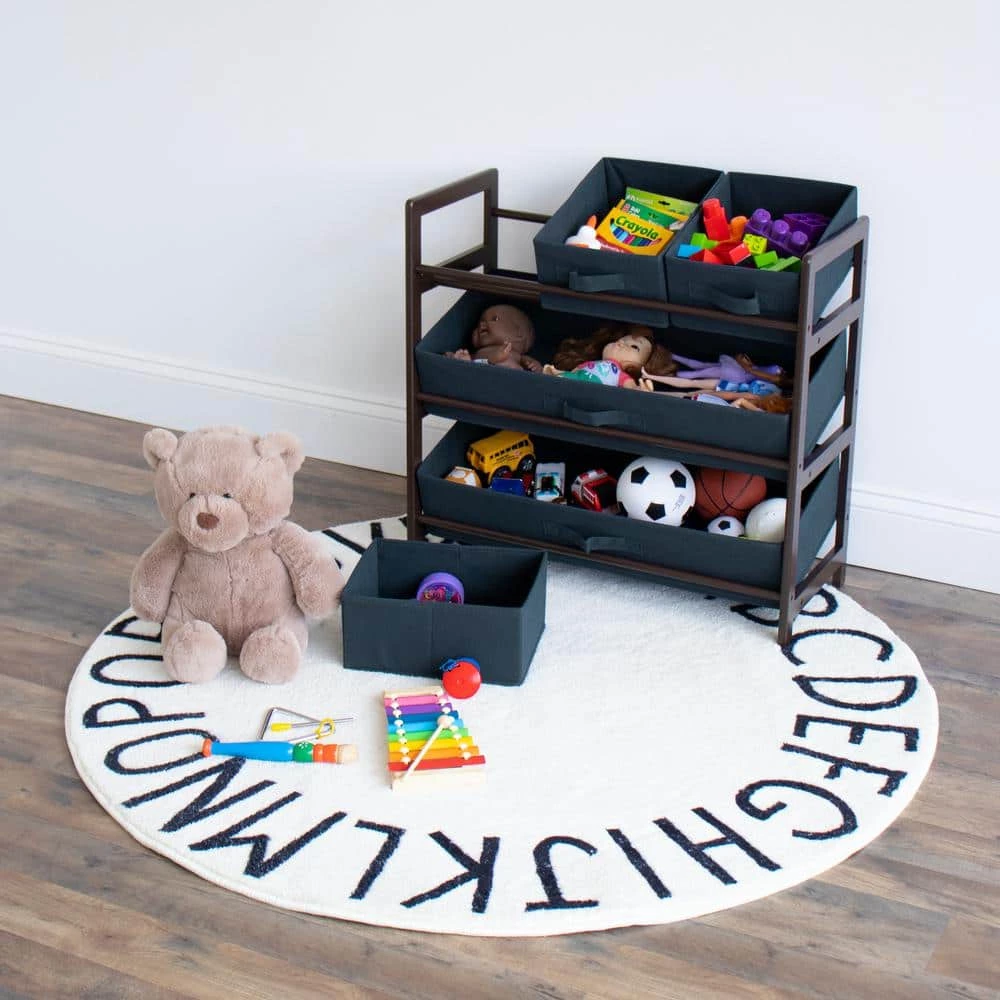 - 5 removable fabric storage bins for playtime and easy clean up, 2 large and 3 standard size