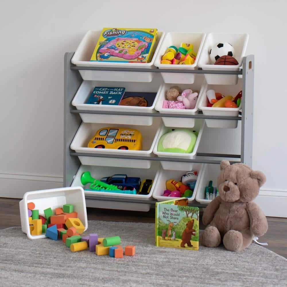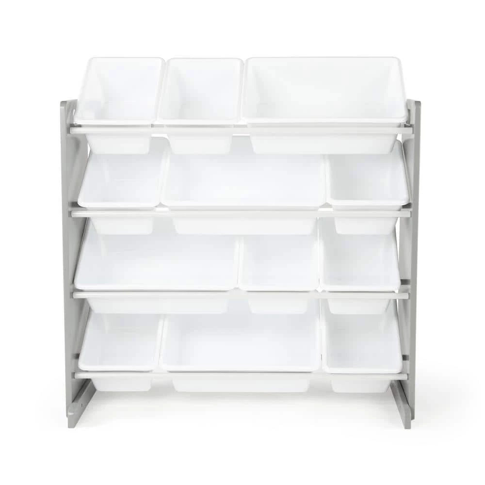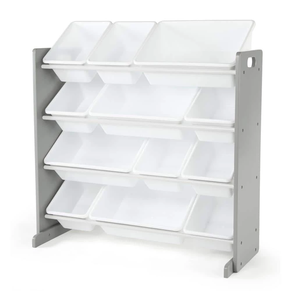 Playtime is more fun when your kids can easily take out their toys, books and games and then quickly clean up afterwards. The space-saving Humble Crew Toy Storage Organizer with 12 Storage Bins stows your children’s toys in easy-to-see, easy-to-access BPA and phthalate free plastic storage bins. 8 standard and 4 large storage containers are easy to remove, replace and reposition along the 4 tiered shelves-sized just right within the toy organizer for toddlers and preschool-aged children. It makes a great toy box storage alternative, helping keep your little one’s room clean and organized while at the same time teaching sorting and cognitive skills. The stylish colorway make this the perfect organizational solution for bedrooms, playrooms and more. Made with a sturdy engineered wood construction frame and steel shelving rods, each level can hold up to 20 pounds. Some assembly is required and all hardware is included.