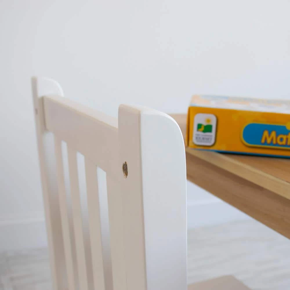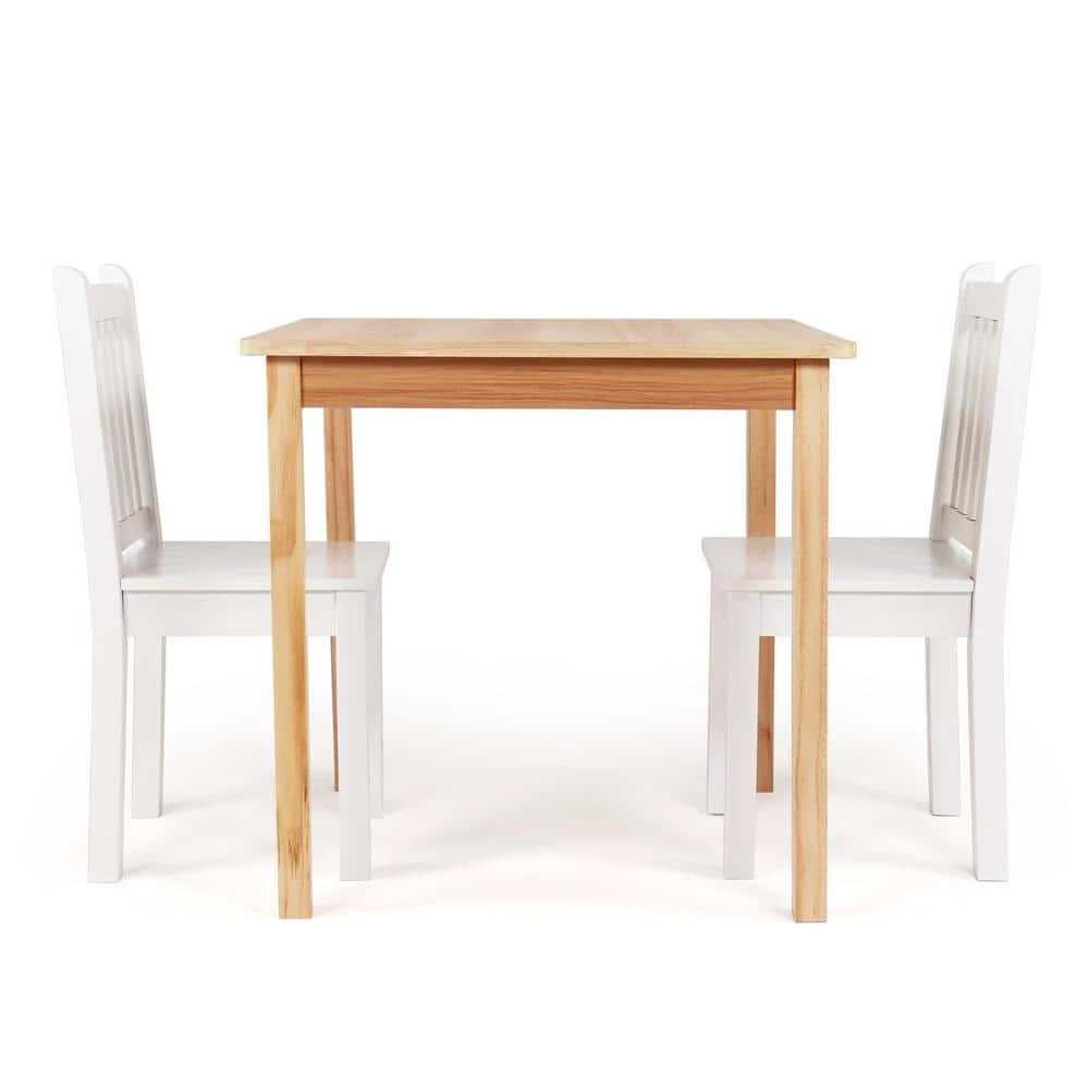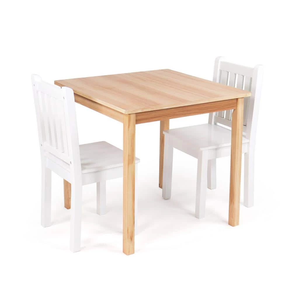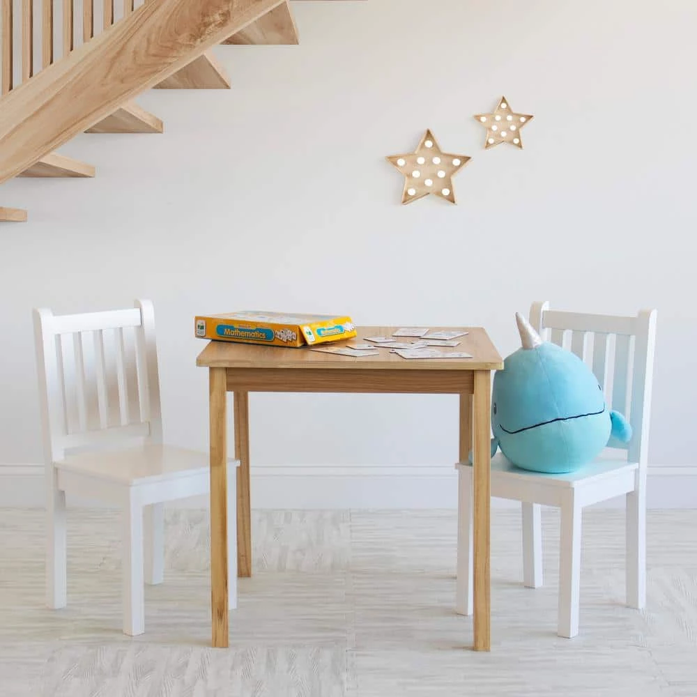 Perfectly sized to meet your growing childs needs, the Humble Crew Journey 3-Piece Big Kids Wood Table and 2 Chair Set is sturdy, stylish and simple to clean. This set can be used as a homework study desk, an arts and crafts activity center, or a board game table. It is also a great homeschooling solution for young students doing online school from home. The height of this furniture is just right for grade school-aged children; giving your little one a table and chair. set at their size gives them a sense of control and helps them learn independence. From snack time.to playtime.this set will quickly become your little ones very own favorite spot in the house to draw and color, read, do puzzles, host tea parties, play cars and trucks and more. The set includes a square table in a contemporary and versatile natural wood grain finish and two white chair. , sure to complement your homes existing furniture whether it be in your toddlers bedroom, playroom or the living room. This furniture set is easy to assemble with all hardware included. The sturdy table and chair. feature solid wood legs for additional support and long-lasting durability, ideally sized for boys and girls between 6 and 10 years old. Product dimensions – Table: 24 in. W x 24 in. D x 23 in. H Chairs: 12 in. W x 13 in. D x 26 in. H Seat Height: 13 in. Each chair. supports up to 70 lbs. Item Weight – 26 lbs.