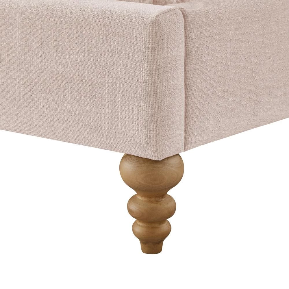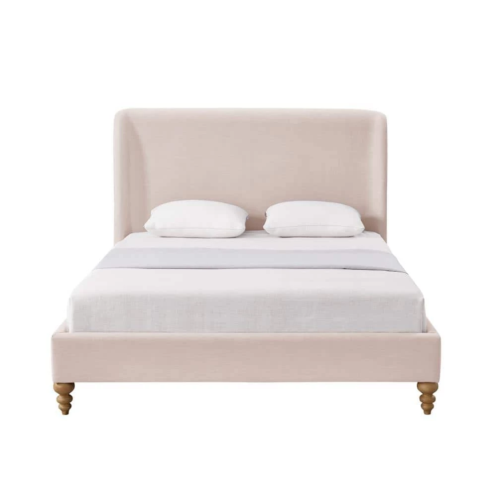 - WINGBACK – Add sophistication to you bedroom with this transitional upholstered bed in linen fabric. Featuring a wing-back design and bun shaped legs in natural wood color, this bed will complement your bedroom decor.