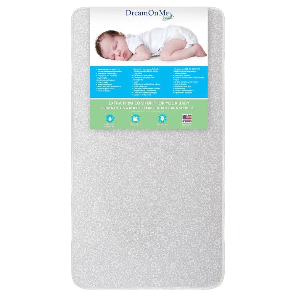 Dream On Me, 5E5G Orthopedic Extra Firm Foam Crib Standard Mattress provides added support and 5″ foam comfort for your baby. The hypoallergenic, antibacterial, waterproof cover is vented for a fresh sleeping environment that aids in the prevention of mildew and odor. Rest easy knowing this mattress is constructed with quality materials and workmanship in the USA and is phthalates and lead free. Easily wipes clean with warm water and a mild soap. Complies with the Federal Standard Flammability Standard 16 CFR 1633