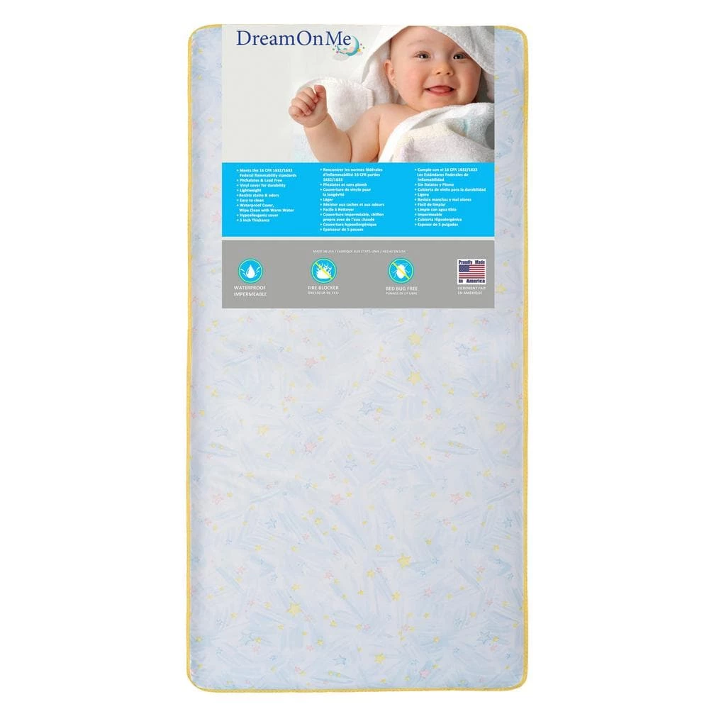 Your little one will sleep soundly on this Dream On Me Star Light Crib Mattress, which has 202 heat-tempered, innerspring coils, waterproof cover with lock-stitched binding that resists stains, mildew and moisture for a healthy sleeping surface.The thick-gauge perimeter border wire gives stability right up to the mattress edge to meet the unique demands of infancy and toddler stage. This Dream On Me Mattress meets Federal Flammability Standard 16CFR 1632/16 CFR 1633.